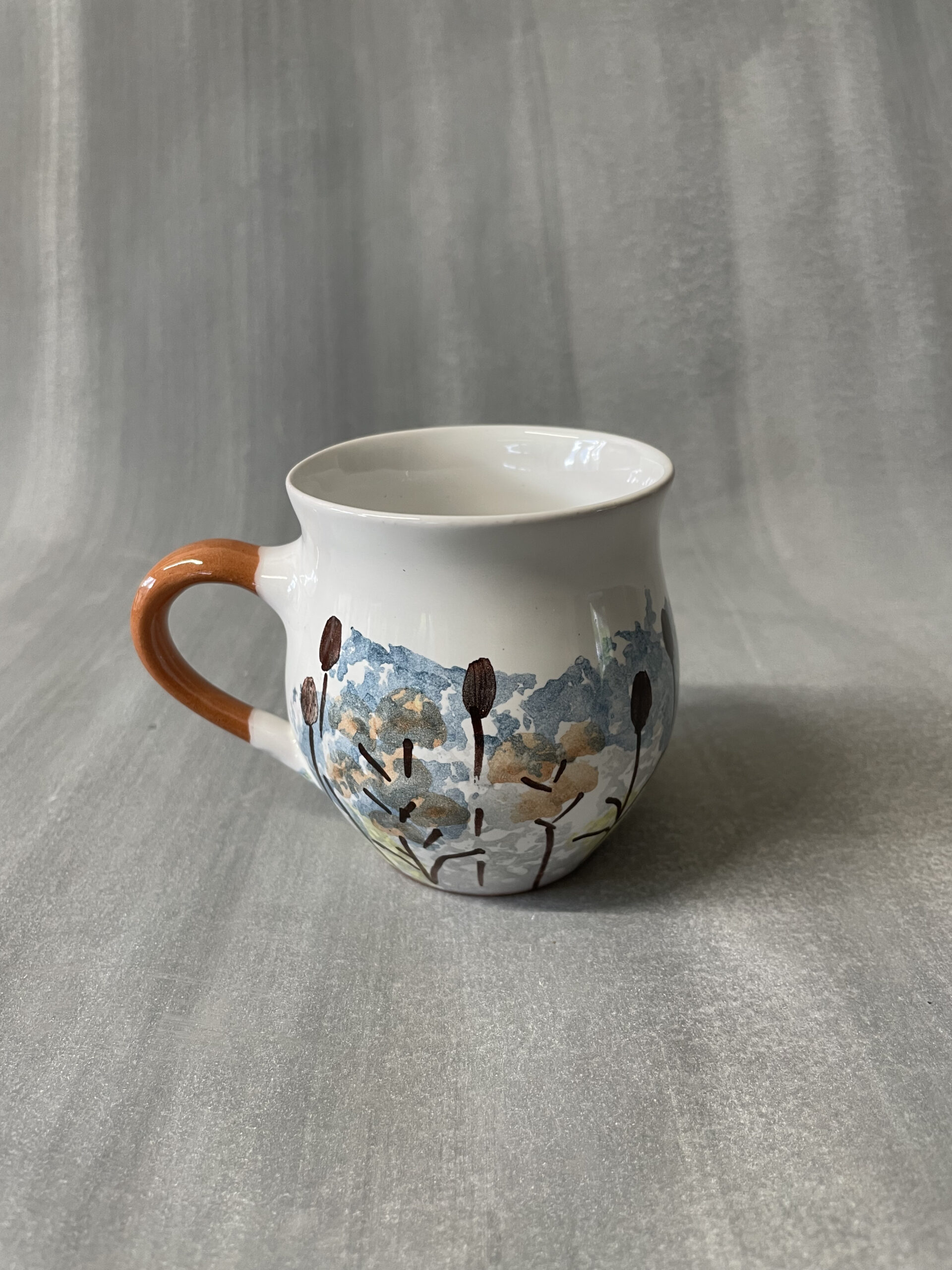 Ručně točený hrnek buclák zdobený jemným květinovým motivem inspirovaným rozkvetlou letní loukou. Díky své pohodlné velikosti a přírodní glazuře je ideální na espresso, bylinkový čaj nebo malé porce oblíbených nápojů.