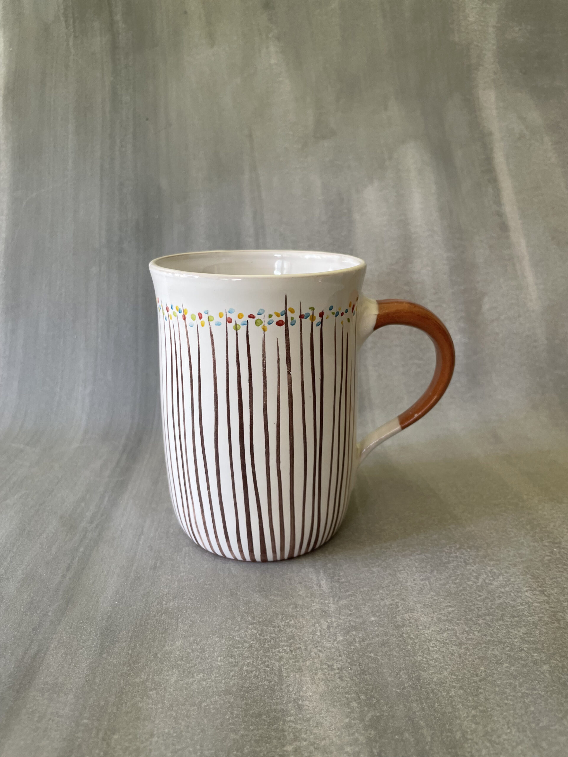 Velký rovný hrnek s dekorem letní louky je ideální pro ty, kteří si rádi vychutnají pořádný čaj, kávu nebo bylinkový nálev. Ručně točený na hrnčířském kruhu a malovaný jemnými tahy připomíná rozkvetlou louku plnou života. Každý kus je originál, který vnese do každodenního používání kousek přírody a klidu.